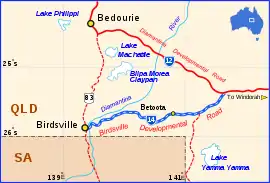 The Birdsville Developmental Road (State Route 14) is a mostly unsealed road in south-west Queensland that branches off the Diamantina Developmental Road at a point 103 kilometres (64 mi) west of Windorah and runs to Birdsville.[1] Its length is 273 kilometres (170 mi).[2] The road crosses a major channel of the Diamantina River just before reaching Birdsville. It links with Cordillo Downs road (via Cordillo Downs station) and Arrabury Road (via Haddon Corner), both of which lead to the South Australian town of Innamincka.[3][4]