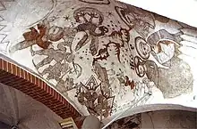 In 1900, frescos depicting a Gethsemane scene were discovered in the chancel by Jacob Kornerup who restored them in 1910.[3] Jesus is depicted before an altar bearing a chalice containing rice, corn and a whip. The three apostles are shown reading as soldiers in armor typical of the 16th century arrive. A pelican with a halo stands in the centre, reflecting a passage from Revelation.[1]