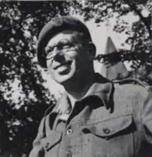 After Mendelsohn and Chermayeff's partnership was wound up, Haward remained in London and continued to work for Chermayeff until 1938.[1][4][5] His politics were to the left, and he joined the Communist party.[1] Like other left-leaning Modernist architects of his generation, he advocated for housing improvements and the construction of air-raid shelters,[3] and he worked on the latter with Berthold Lubetkin and his company Tecton.[4] In 1941–42, he designed accommodation for ordnance factory workers in Staffordshire, in a group directed by William Holford.[1][3][4] He created a mural in one hostel.[3] In 1942–43, he managed the Association of Architects, Surveyors and Technical Assistants trades union.[1][4] In April 1943,[lower-alpha 1] he joined the Royal Engineers' 82 Assault Regiment and served in France and Germany, with the rank of lieutenant.[1][3][4][6]