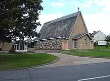 Haward designed the grade-II-listed Castle Hill Congregational Church in Ipswich (1955–56), which is characterised by its extremely steep roof with an unusual profile; its walls are decorated with coloured panels in a lozenge pattern.[10][11] He rarely designed private houses; the most notable example is The Spinney, also grade II listed, a "quirky"[3] timber house built in Ipswich for himself and his family in 1960.[1][3][10] The house centres around a two-storey hall with a first-floor gallery.[12] The architectural writer Alan Powers regards it as among his best work.[1] Haward's other output includes housing projects,[2] projects for the Cambridge Hospital Board,[2] commercial buildings,[1] office blocks,[5][10] and industrial buildings, such as the Fisons facility at Levington, Suffolk (1957).[5][13] His work often employs geometrical patterns and structures fashionable during 1950s.[1] He was known for designing timber-framed domed roofs for sports halls.[5]