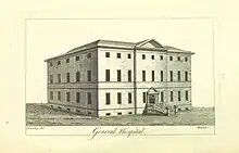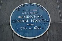The hospital finally opened on 20 September 1779,[1][4][5] giving its name to Hospital Street.[2] About 200 patients were treated in its first three months of operation,[5] even though the 40 beds were fewer than half those aimed for.[1] Two, two-storey side wings were added in 1790.[6] Further extensions were made in 1857 and 1880.[6] Eventually 235 beds were provided on the site.[1] The site was later used for a tram, then bus, depot and is now occupied by Centro House, headquarters of the Transport for West Midlands, where there is a blue plaque (at 52°29′15″N 1°53′59″W / 52.487475°N 1.899811°W) commemorating the hospital.[7]