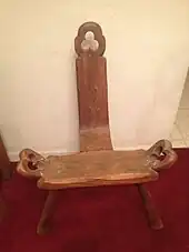 The birthing chair has been used for millennia, appearing for example in Exodus 1:16: And he said, 'When ye do the office of a midwife to the Hebrew women and see them upon the birthstool. Birthing chairs took the place of laboring mothers sitting on birth attendant's laps, as it was the previous practice. These chairs were used before male physicians dominated the delivery room.[2] The use of birthing chairs or similar devices has been seen around the globe, not isolated to a particular region. Women giving birth in the upright position have been depicted in Asian, African, Pacific Islander, and Native American art. The birthing chair can be traced to Egypt in the year 1450 B.C.E. Pictured on the walls of The Birth House at Luxor, Egypt, is an Egyptian queen giving birth on a stool. It can also be traced to Greece in 200 B.C as it is featured on an ancient Grecian sculpted votive.[1] Celtic items from 100 B.C.E in Britain also depict women sitting in the same upright position as if in a birthing chair. The first depiction in a woodcut from the 16thc shows a woman sitting on a stool and surrounded by other women.[3] The three legged birth stool, sometimes called a groaning stool, was designed to be carried disassembled, and sits low to the ground. Some examples, such as this continental birthing chair, are adjustable with the back extending so the woman could move from an upright position to a reclined position.[4]