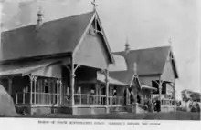 The front elevation is dominated by the ends of the high twin gables. These extend across the verandah and are supported by decorative bracketed posts, creating two bays between which the central section runs. This has a lower roofline and a single ventilator in the centre of the ridge. At the centre of this section is a small gable forming an entrance porch. All three gables are decorated with timber bands placed to resemble half timbering. The central gable is surmounted by a cross.[1]