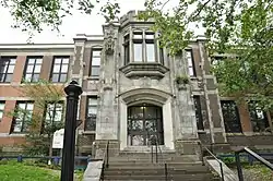 The current building, located at 044 Bond Street and built in 1926 by Anglin and Norcross, was designed by the architect Eustace G. Bird in Collegiate Gothic Revival style. This style was typical for Church of England buildings that were commissioned under Bishop Feild.as he sought a "high-church" tone set around the Anglican Church. The building plan is a rectangular, long façade. Its defining elements include crenellation and rusticated stone. Indiana limestone is used, with limestone quoining at corners. At the entranceway, there are places that represent the coasts of arms of the school, city, province, and the diocese. Large windows are also located at the entranceway. Keystone trim can be found around windows.[7] BFC was named as a Registered Heritage Structure by the Heritage Foundation of Newfoundland and Labrador in June 1994.[8]