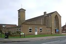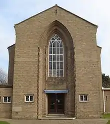 It was designed and built by Sir Edward Maufe between 1938 and 1939, who was notable, chiefly, for his design of Guildford Cathedral and his work for the Imperial War Graves Commission. The church is a large building on a corner site, with an entrance at the west end and a tall bell tower at the northeast corner. Brown brick is the main building material, although the roof is laid with pantiles. This roof has a shallow pitch, while the large tower has a similar but steeper roof topped with a cross. An annex used as a day centre was added on the northern side in the 1970s in a matching style, although it has a flat roof. The main body of the church consists of a chancel, an organ bay in the tower and a Lady chapel in the southeast corner. The nave has 5½ bays with aisles on each side. The main entrance at the west end is set into a tall pointed arch faced with decorative brickwork. Above this is a deeply recessed arched window, and there are two similar but smaller windows in the adjacent north and south faces. The floor of the chancel is laid with travertine, a rock which resembles both limestone and marble, and the nave incorporates locally produced beech wood. The martyr's crown device is used frequently in the internal fittings and decoration, reflecting Bishop Hannington's martyrdom.[4]