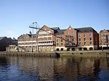Development of the area continued through the 19th century, with the second half of the century seeing much of the remaining open area covered with small terrace housing. Notable buildings of the period include the warehouses on Queen's Staith and the Bonding Warehouse on Skeldergate.[2] The large Emperor's Wharf was devoted to the transshipment of timber but, by the end of the century, seagoing ships docked further downstream.[5] Away from the river, the former sawmill at 52 Skeldergate and the Golden Ball pub are key survivals.[2] A community cooperative took over the Golden Ball in 2012, as the owners sought to retire.[6] Many 19th-century churches survive, including the former Victoria Bar Primitive Methodist Chapel, Wesley Chapel on Priory Street, and St Columba's Presbyterian Church.[2]