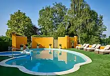 In 1950, the house was sold by the Temple family to W. Keith Neal,[9] a firearms collector, and in 1976 it was purchased by Kurt Schiller, who the next year turned it into a ten-bedroom hotel. It has since been extended to provide more rooms.[1] In 1988 the hotel was bought by the Blandy family.[1] In 1995 it was again sold; in 2001, it became part of the Von Essen hotel group, and in 2011 part of the Longleat Hotel Group.[1] In 2018, the hotel was bought by Versant Developments.[10] In 2021 it had twenty-four double bedrooms, six suites, and two family rooms.[11]