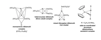 The common synthetic precursor is the trimethylsilylmethyl-cyclobismuthane. Upon reaction with tungsten pentacarbonyl, the resulting side-on adduct preserved the dibismuthene unit, while reaction with diiron noncarbonyl yields the a tetracylic heteronuclear iron-bismuth carbonyl compound (see scheme to the right).[9][10]