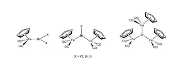 Among the first representatives of the organometallic bismuth chemistry are a series of iron cyclopentadienyl compounds synthesized by Cullen et al. Characteristic to these is a σ Fe-Bi bond, the iron center bound to 1 cyclopentadienyl and to carbon monoxide ligands only having 17 electron in its coordination sphere in the absence of the Bi bond.[3][4]
