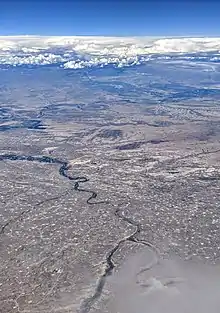 Bitter Creek (lower center/left) at its confluence with the White River, surrounded by the Bitter Creek gas field.[1] The Green River's Horseshoe Bend and Vernal, Utah, are visible in the distance.