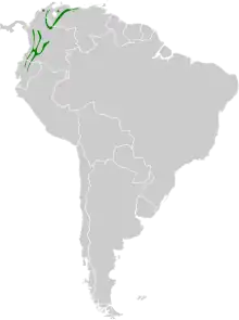 Black-capped tanagers are found in tropical moist montane forests in northern Ecuador, Colombia, and Venezuela.[1][9] The species is found at the edges of subtropical forest, secondary woodland, and trees and bushes in nearby open spaces, although it is locally uncommon.[4][10] Its elevational range is variously described as being between 1,300 and 2,200 metres (4,300 and 7,200 ft),[1] and between 1,000 and 2,800 metres (3,300 and 9,200 ft) above sea level, although most records occur between 1,500 and 2,200 metres (4,900 and 7,200 ft). An isolated record exists from 700 metres (2,300 ft) above sea level.[4] It is found in the Colombian, Venezuelan, Ecuadoran, and Peruvian Andes, including in the Sierra de Perijá, and also in the Santa Marta mountains in Colombia. Within Ecuador, it was first recorded on the western slopes of the Andes only in 1980, leading researchers to suggest it may have expanded its range as a result of deforestation.[10]
