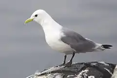 The adult is 37–41 cm (15–16 in) in length with a wingspan of 91–105 cm (36–41 in) and a body mass of 305–525 g (10.8–18.5 oz).[8] It has a white head and body, grey back, grey wings tipped solid black, black legs and a yellow bill. Occasional individuals have pinky-grey to reddish legs, inviting confusion with red-legged kittiwake. The inside of their mouth is also a characteristic feature of the species due to its rich red colour. Such red pigmentation is due to carotenoids pigments and vitamin A which have to be acquired through their diet.[9] Studies show that integument coloration is associated with male's reproductive success.[9] Such hypothesis would explain the behavior of couples greeting each other by opening their mouth and flashing their bright mouth it to their partner while vocalizing.[10] As their Latin name suggests, they only possess three toes since their hind toe is either extremely reduced or completely absent.[7] The two subspecies being almost identical, R. tridactyla pollicaris is in general slightly larger than its counterpart R. tridactyle tridactyla. In winter, this species acquires a dark grey smudge behind the eye and a grey hind-neck collar. The bill also turns a dusky-olive color.[7]
