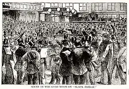 On September 12, Grant warned Boutwell that a "desperate struggle" was taking place between the "bulls and bears" of the gold market and that Boutwell should continue the current policy, which was to suspend the sales of gold. Corbin told Gould he was concerned that Grant would start selling gold from the Treasury, so Gould told Corbin to write a letter to Grant encouraging him not to sell.[4] Corbin wrote Grant the letter, now lost, encouraging Grant not to sell gold. Fisk had the letter delivered by William Chapin of the Erie Railroad, to Washington, Pennsylvania, where Grant was vacationing with his wife's cousin. Interrupting Grant's croquet game, Chapin gave him Corbin's letter, whereupon Grant read the letter and told Chapin that it was satisfactory, but said, "No, nothing" when Chapin asked for a reply.[11] When Chapin had left, Porter told Grant about Gould setting up a $500,000 gold account in Porter's name.[19] Upon hearing this, Grant finally realized what Gould and Fisk were up to. Through a letter his wife was writing to his sister, Grant urged Corbin to have nothing to do with Gould and Fisk and get out of the speculation, and Grant promptly arranged a meeting with Boutwell.[20] On September 20, 1869, Gould and Fisk started hoarding gold, driving the price higher. Gold closed at $141 on September 22, at which time Fisk and Gould owned between $50 and $60 million in gold between the two of them, about three times the public supply available in New York. The increase in gold prices on this day alone had netted a profit of $1.75 million for the two conspirators.[21] On Thursday, September 23, Gould visited Corbin's house and was informed of Julia's letter, which had arrived that day. After reading it and discovering that Grant was annoyed with Corbin's speculations, Gould knew that Grant was likely to sell government gold on Friday.[22] Subsequently, Corbin asked Gould if he would buy Corbin's account so he could tell Grant that he no longer owned any gold, but Gould refused to bail Corbin out, fearing it would trigger a collapse in the market. Instead, he offered Corbin $100,000 interest[23] and exclaimed, "Mr. Corbin, I am undone if that letter gets out".[24] Gould chose not to inform Fisk of this recent development.[25] When Grant returned to Washington D.C., he found $60,000 worth of gifts from the Gold Ring sent to the White House. Sensing bribery, Grant immediately ordered the paintings and statues boxed up and returned.[20]