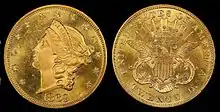 A twenty dollar Liberty Head – Double Eagle gold piece, issued in 1869, commonly used in banking transactions.