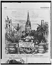 Dodging any financial harm, Fisk and Gould escaped conviction, spending money to buy the best legal defense, including talented attorney David Dudley Field, while Democratic Tweed Ring judges such as Albert Cardozo shielded them in court. Gould remained a force on Wall Street, and when he died in December 1892, his estate was worth $70 million. Fisk remained wealthy, but was caught in a scandalous romance for a lady's affection and was shot to death by a jealous lover on January 6, 1872. Boutwell served the remainder of Grant's first term, until in 1873 he resigned to be elected United States senator from Massachusetts. He served in the Senate until 1877 and afterwards retired to private life.[31] In 1871, the Tweed Ring run by "Boss" Tweed was broken by New York reformers including Edwards Pierrepont, Grant's future Attorney General, and prominent member of the Committee of Seventy. [38][39]