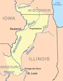 In the 18th century, the Sauk and Meskwaki (or Fox) Native American tribes lived along the Mississippi River in what are now the U.S. states of Illinois and Iowa. The land they lived on was considered sacred because of the fertile soil, prime hunting, accessibility to lead, and access to water, which was helpful for trade. The two tribes had become closely connected after having been displaced from the Great Lakes region in conflicts with New France and other Native American tribes, particularly after the so-called Fox Wars ended in the 1730s.[5] By the time of the Black Hawk War, the population of the two tribes was about 6,000 people.[6]