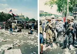 The army fired M16 rifles directly at the crowd at 4.15 am, after initially firing in the air to disperse the protesters. At least five people believed to have been killed in this shooting, with others injured by baton attacks.[16] Hospitals in the area were already receiving the injured, including four with gunshot wounds who died that night.[10] Government buildings and police vehicles were set on fire, a "third party" was involved in initiating violence on Phan Fa Bridge, according to Chamlong.[16]