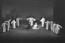 Black Nativity is an adaptation of the Nativity story by Langston Hughes, performed by an entirely black cast. Hughes was the author of the book, with the lyrics and music being derived from traditional Christmas carols, sung in gospel style, with a few songs created specifically for the show. The show was first performed Off-Broadway on December 11, 1961, and was one of the first plays written by an African American to be staged there. The show had a successful tour of Europe in 1962, one of its appearances being at the Spoleto Festival of Two Worlds in Italy.[1]