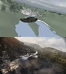 Luma Pictures worked on the Busan car chase sequence, digitally creating the cars featured in the sequence based on CAD models and on-set reference. Multiple digital versions of the same car were created, so the production could have the actual cars crash and do various stunts with them, with Luma then inserting the digital versions to augment these moments. Luma also created the sonic forces from Klaue's cannon, while Scanline VFX worked on digitally removing Serkis's left arm for the London museum heist sequence.[161] Several companies worked on the vibranium sand effects used in Wakandan technology, including ILM for the beginning of the film.[145] Perception spent 18 months researching real-world technologies, phenomena, and visual themes to aid them in their work on the film. Their designs for the vibranium sand were based on research being done with ultrasonic transducers for the purpose of mid-air haptics and acoustic levitation. They integrated this research into the kimoyo beads worn by Wakandans and as a working interface on the royal talon fighter. Perception also created the traditional displays on the talon fighter and in Shuri's lab. For the talon fighter, the company "experimented with parallax, depth, and volume in the information being displayed, as well as developing a unique color palette to brand the Wakandan tech". In Shuri's lab, Perception adjusted the hues on the wall to match her attire, and for her healing room "proposed that the hexagonal pattern seen on the wall actually reveal itself to be articulating panels" that "pulse and ripple". The company also created the function of Black Panther's suit with nano technology and "layering the suit with different patterns as well as adding 'sub-dermal' luminescent tattoos", the virtual car chase with Shuri and T'Challa, and designed the opening prologue, with the final version created by Storm VFX. Perception also created the main-on-end title sequence.[162]