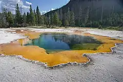 Black Sand Basin is one of a grouping of geothermal hot springs and geysers located in the Upper Geyser Basin of Yellowstone National Park, Wyoming.[1][2] The spring is too hot to use as a mineral bath as its scalding 200 °F (93 °C) or hotter water has proven to be fatal.[2] In the winter, a marked ski trail runs from the Old Faithful Visitor Center to Black Sand Basin[3]