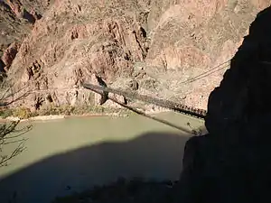 The Black Suspension Bridge (also known as the Kaibab Trail Suspension Bridge) spans the Colorado River in the inner canyon of Grand Canyon National Park. The span length is 440 feet (130 m).[1] The bridge is part of the South Kaibab Trail and is the river crossing used by mules going to Phantom Ranch. The Black Bridge and Silver Bridge, located about 700 metres (2,300 ft) downstream, are the only spans in hundreds of river miles.