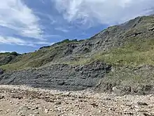 Black Ven has the largest mudslides in Europe, and this constantly brings new material (such as fossils) to the base of the cliff and beach. The reason for this is the types of stone found through the cliff. There is porous limestone, which lets the water on rough days flow through it, below which you will find clay, which lets water in, but not out. When the clay becomes saturated, it becomes very slippery and the limestone above can slide off in large chunks. Black Ven for this reason is a famous fossil hunting location, although the mudslides can be surprisingly damaging to the fossils, especially to soft parts such as scales. The Black Ven has a layer called Blue Lias where famous fossilised fish are known to be found. The geological dating of the rocks of the whole of the area (Lyme Bay) is Jurassic. The Black Ven and the Spittles contain rocks from the lower (early) Jurassic. Ammonites, Belemnites, and the occasional Devil's toenail are common finds in this area.