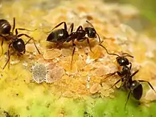 Lasius niger removes predators such as ladybirds from the vicinity of black bean aphid thus keeping their "milch cows" safe.[7] On a test plot of field beans (Vicia faba), plants without black bean aphids yielded an average of 56 seeds per plant, those with aphids and no ants yielded 17 seeds, and those with both ants and aphids averaged eight seeds per plant.[8] Vicia faba also produces extrafloral nectaries that Lasius niger can feed from directly.[9]