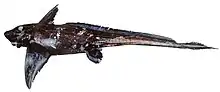 The black ghostshark can grow up to 66 cm (26 in) in body length, with a maximum total length of 108 cm (43 in) for males.[1][4] Its body is dark in color, typically black or a dark shade of brown.[5] Its eyes are large and its snout is slightly pointed.[6] Its dorsal spine is large and it has round pelvic fins. Its claspers have areas of bristles on them and are somewhat short and thin.[7] Its appearance is similar to that of the abyssal ghostshark, another species of chimaera to which it is closely related; however, the black ghostshark's dorsal spine is longer than that of the abyssal ghostshark and its claspers are darker and smaller.[1]