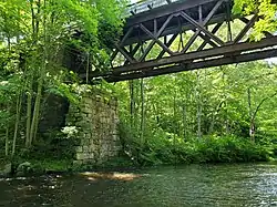 The line continued to serve local passenger and freight trains for decades, but flooding in August 1955 destroyed the critical bridge work in Putnam and lead to its closure in the 1960s.[11] Several years after its abandonment the railroad was sold to Connecticut's Department of Transportation.[10] By 1983, the abandoned railroad bridge had its span sealed off and its tracks lifted. The bridge is in the Salmon River State Forest and is a part of the Air Line State Park Trail.[2][12] A new wooden bridge allows transportation over the Blackledge River.[12] Constructed prior to 2007, the new wooden bridge decks the railroad bridge.[13] The Connecticut Department of Environmental Protection was assisted by the Coast Guard Academy and the 192nd Engineering Battalion of the Connecticut National Guard.[13]