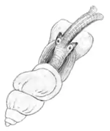 Blanfordia has short stubby triangular tentacles.[2][5][6] Short tentacles is derived character, while long tentacles is a primitive character (a plesiomorphic trait) within the Littorinimorpha.[6] Eyes are at the base of tentacles.[2] According to Nelson Annandale the snout is narrow and long.[7]