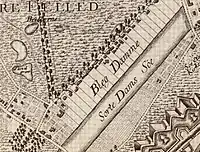 Blegdamsvej is first mentioned in 1694 and takes its name after the 24 ponds on the west side of Sortedam and Peblinge Lake, which was used for textile bleaching. They were established in about 1772 and had numbers from south to north, beginning at present day Sankt Hans Torv.[1] On the other side of the ponds was Blegedam Common, the oldest of Copenhagen's commons, where the bleachers left the cloth to bleach in the sun. Lined with trees on both sides, mainly horse chestnut, willow and lime trees.