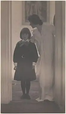 Blessed Art Thou Among Women is a photograph by American photographer Gertrude Käsebier. It was taken in 1899, and depicts poet Agnes Rand Lee and her elder daughter Harriet "Peggy" Lee in their home in Jamaica Plain, Massachusetts.[1] The photograph is an example of the many images Käsebier created of the bond between mother and child. The work exemplifies the chiaroscuro and atmospheric quality of light in Käsebier's photographs. Käsebier was so unhappy with her own marriage that she spent many years separated from her husband. Her objections to the institution of marriage seem inconsistent with the gendered view of woman as caretaker reflected in Blessed Art Thou.
