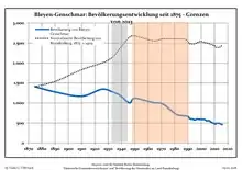 Development of population since 1875 within the current boundaries (Blue line: Population; Dotted line: Comparison to population development of Brandenburg state; Grey background: Time of Nazi rule; Red background: Time of communist rule)