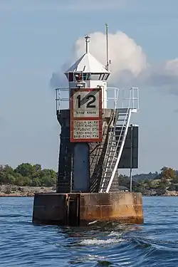 The eastern part of Blockhusudden is called Plommonbacken and has many country houses built in the 18th and 19th centuries. On the promontory, there is a café with views of Nacka. A lighthouse was installed in the middle of the Stockholm Channel in 1905. But in 1912 the lighthouse turned into AGA lighthouse by the invention of Gustaf Dalén.[3]