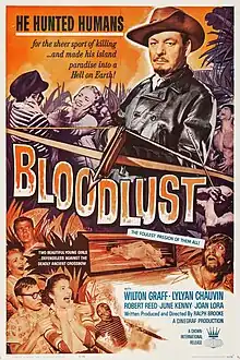 Bloodlust! is a 1961 American horror thriller film written, directed and produced by Ralph Brooke and starring Wilton Graff, June Kenney, Joan Lora, Eugene Persson, and Robert Reed. It is based on Richard Connell's 1924 short story "The Most Dangerous Game." It was produced by Robert H. Bagley. Its plot follows four young adults who visit a tropical island only to become prey for a sadistic hunter. It was filmed in 1959 but not released until 1961, when it was the second film on a double feature with The Devil's Hand.