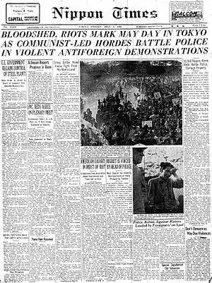 Bloody May Day (血のメーデー事件, Chi no mēdē jiken) refers to a violent conflict that took place between protesters and police officers in the Kokyo Gaien National Garden in front of the Imperial Palace in Tokyo, Japan, on May 1, 1952. When a large crowd protesting the U.S.—Japan Security Treaty refused to disband, a bloody melee took place between protesters and police officers. Eventually the police officers opened fire on the crowd, killing 2 and injuring 22 with bullet wounds.[1] Altogether, around 2,300 people (1,500 protesters and 800 police officers) were injured in the fighting.[2]