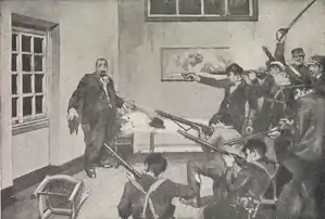 As night fell, a "ghost truck", led by Abel Olímpio,[3][4] roamed Lisbon with the aim of murdering a list of notable people.[2] The first to be killed was António Granjo, who fled from his home in Rua João Crisóstomo and hid in Francisco Pinto da Cunha Leal's (who had ties with the revolutionary movement) nearby house, in Avenida Miguel Bombarda.[2] When the rebels found Granjo, they forced Cunha Leal to hand him over.[2] The rebels were purportedly taking Granjo to the NRP Vasco da Gama, but rebels tried to kill him as he reached Terreiro do Paço.[2] He was then shot in the neck as he neared the boarding bridge near the Navy Arsenal. Some military rebels tried to pull him inside the Navy Arsenal, but the mob succeeded in killing him with guns and swords.[2] Cunha Leal was wounded while trying to defend Granjo.[4] Then, José Carlos da Maia was also killed near the Navy Arsenal.[2] António Machado Santos was killed in the early hours of 20 October 1921 in Largo do Intendente.[2] Freitas da Silva was shot and died in hospital.[2] Colonel Botelho de Vasconcelos and a driver called Carlos Gentil were also killed.[4] The riot appeared to have targeted Sidonist politicians,[2] except for Granjo.[4]