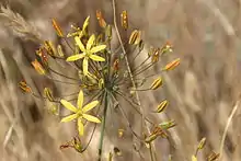 Bloomeria crocea, also known as goldenstar, is a geophyte from southern California and northern Baja California. It is found along hillsides, in grassland and chaparral edges, and in dry flats.
