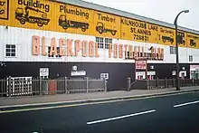 The Evening Gazette and The Green adverts remained until the 1980s; however, that of Harold Smith's garage – which, along with the former two, was repainted in the reverse colours of white-on-black – was halved in length and re-branded "Premier Garage South Shore" in the mid-1960s. The Ismail & Co. Ltd advert, meanwhile, was amended.[77] During the 1969–70 season this was joined, to its northern side, by an advert for Vauxhall & Bedford, which led to the Premier Garage advert being halved in size. Around 1976, the Evening Gazette and The Green paint was changed to black-on-green firstly, then black-on-white, while the Premier Garage and Vauxhall & Bedford sections were repainted to feature an advert for Lancaster-based Oliver Rix's British Leyland Garages[78] in tangerine lettering on a blue background. Ismail & Co. Ltd.'s advert remained.