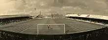 In 1925, a new South Stand was built to provide a new boardroom, offices, dressing rooms, baths and refreshment bars. It cost just over £13,000 and held 4,000 people, bringing the total ground capacity to well over 20,000.[8] Also this year, a new directors' box was built in the North-West Corner of the ground. It was used for the first time for the visit of Southampton on 29 August 1925. Ernest Lawson commented in the Gazette & Herald: "It's a nice box they have placed themselves in; it must be for safety, for it is far enough out of the way! But of what are they frightened?" He offered an answer at a later date: "The Let Me Smoke railway stokers are a choking nuisance. Now we know from what the directors are protecting themselves." He was referring to the smoke that regularly drifted in at the north-west corner of the ground, caused by passing steam trains. Lawson added: "The crowd do, however, have the last laugh when the wind comes in from the east!"[5]