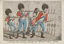 The 'Bloomsbury and Inns of Court Volunteers' was one of the Volunteer Corps raised in June 1797 during the French Revolutionary Wars. It was formed by the residents of the London district of Bloomsbury and the lawyers of the Inns of Court. Its uniform was depicted by Thomas Rowlandson as a red jacket with yellow facings, white breeches and black gaiters, with white cross-belts and a 'round hat' (similar to a Top hat) surmounted by a comb-like black plume.[1][2]