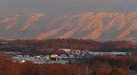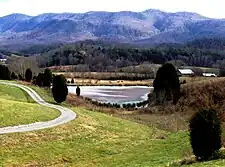 The southern part of Blount County is part of the Great Smoky Mountains, and is protected by the Great Smoky Mountains National Park. The crest of the range forms the county's border with Swain County, North Carolina, and includes Blount's highest point, 5,527-foot (1,685 m) Thunderhead Mountain, and the 4,949-foot (1,508 m) Gregory Bald, a prominent grassy bald. The northern part of the county is part of the Ridge-and-Valley Appalachians.[15] The geologic boundary between the Blue Ridge (which includes the Smokies) and Ridge-and-Valley provinces runs along Chilhowee Mountain, a long and narrow ridge that stretches across the central part of the county.[16] Much of Blount's topography is characterized by elongate ridges and rolling hills— known locally as "The Foothills"— which emanate outward from the Smokies range.