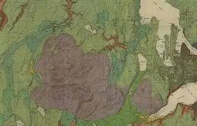 - ↑ "The Puget Lowland is a north-south-trending structural basin that is flanked by Mesozoic and Tertiary rocks of the Cascade Range on the east and by Eocene rocks of the Olympic Mountains on the west." Barnett et al. 2010, p. 2, and see Figure 1.