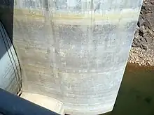 The Blue Mesa Powerplant is fed by one 16-foot (4.9 m) diameter penstock, which supplies two turbines, as well as feeding the outlet works. The laterals feeding the Francis turbines are controlled by 156-inch (4.0 m) butterfly valves. The initial generating capacity was 60 MW, increased in 1988 to 86.4 MW. The powerplant is located above ground at the toe of the dam.[7] It operates as peaking plant.[5]