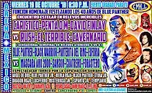 Genaro Vazquez Nevarez, better known under the Ring name Blue Panther, made his professional wrestling debut on October 8, 1978.[1] His first break came working for the Universal Wrestling Association in the early 1980s. In the UWA he won the UWA World Welterweight Championship,[2] and the UWA World Junior Light Heavyweight Championship twice.[3] He later moved on to Consejo Mundial de Lucha Libre (CMLL), the promotion he worked for, for most of his career. In CMLL he became involved in the storyline feud that would not only bring him to national and international attention but also helped cement his reputation as highly talented wrestler, a feud against "Love Machine" Art Barr, The feud spanned two promotions (CMLL and Asistencia Asesoría y Administración), included two high profile Lucha de Apuestas, or bet matches, where Blue Panther won the mask, and then the hair of Barr, as well as a long series of main event matches.[1][4] In CMLL Blue Panther's won the CMLL World Middleweight Championship,[5] the CMLL World Tag Team Championship with Atlantis,[6] CMLL World Trios Championship twice,[7][8] and the Mexican National Trios Championship twice.[9] In 2007 he won the mask of Lizmark Jr.,[1] but lost his own mask the following year to Villano V.[10] At his 35th Anniversary Show in 2013 Vazquez introduced two of his sons to the wrestling world, Blue Panther Jr. and Black Panther. For the 40th-anniversary show, Vazques was involved in booking two matches for the show, including creating the Copa Halcón Suriano in honor of his wrestling trainer.