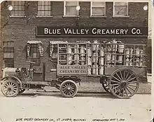 Blue Valley Creamery Company was founded by Huston Wyeth[4] (1863–1925) and James A. Walker around 1900. Huston Wyeth's father, William Maxwell Wyeth, had built a hardware, saddlery and real estate empire in St. Joseph, Missouri.[5] Wyeth took over the business and branched into other endeavors, including formation of the Artesian Ice & Cold Storage Company in 1892. James Walker had been involved in the dairy business since 1888.[6] Their respective experiences with cold storage and transportation on Wyeth's part and dairy on Walker's part likely contributed to the formation and success of the venture.