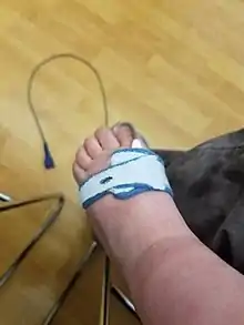 Pulse oximeter on infant's foot.
