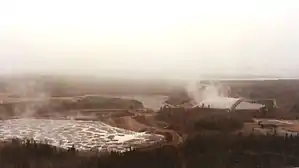 In the 1960s a kraft pulp mill was constructed by Scott Paper Company at Abercrombie Point, 4 km (2.5 mi) to the west. Keen to promote economic growth, the provincial government led by Robert L. Stanfield agreed to take responsibility for effluent leaving the mill for a period of 30 years, and turned Boat Harbour into a settling pond by constructing a dam across its mouth. In 1967, Pictou Landing First Nation were compensated $65,000 for future use of the harbour. A pipeline was dug that carries pulp mill waste from the mill site at Abercrombie Point, under the East River, to the treatment facility at Pictou Landing.[14] Within days of the mill's operation, aquatic life began dying and the water level rose by 2–3 m (6.6–9.8 ft),[12] flooding 12 ha (30 acres) of reserve lands.[15] In 1971 two settling ponds and an aerated stabilisation basin were constructed where the effluent entered the lagoon. In 1975, a pipeline replaced the ditch that effluent flowed through before entering the system.[12]
