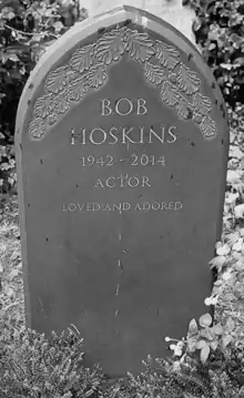 Among film and TV stars who paid tribute at his funeral were Stephen Fry, Hugh Laurie, Michael Caine, Anthony Hopkins, Michael Gambon, and Helen Mirren, among others.[20][42] Hoskins is buried in Highgate Cemetery in London.[43]