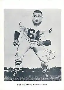Robert Guy Talamini (January 8, 1939 – May 30, 2022) was an American professional football player who was a guard in the American Football League (AFL). He played college football for the Kentucky Wildcats, earning third-team All-SEC honors. He was selected by the Houston Oilers of the American Football League (AFL).[1] His professional career began with the AFL's first training camp in 1960, and was capped the day the New York Jets stunned the NFL's Baltimore Colts in Super Bowl III on January 12, 1969.